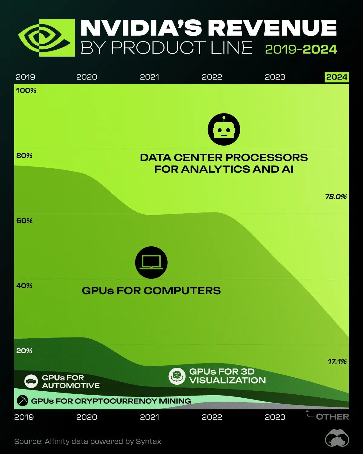 NVIDIA est célèbre principalement pour ses ventes de GPUs. Ces composants, une fois intégrés à un ordinateur, permettent d'exécuter des calculs complexes très rapidement. Ils sont essentiels pour afficher les graphismes des jeux vidéo, effectuer les calculs nécessaires en machine learning ou encore dans les technologies embarquées des voitures connectées. Actuellement, NVIDIA domine ce marché. Son principal concurrent, AMD, est davantage privilégié dans l'univers des jeux vidéo pour le rendu graphique. Cependant, si l'industrie du jeu vidéo n'a pas connu une croissance explosive, celle du machine learning (IA) a vu sa demande exploser, et ce n'est que le début.